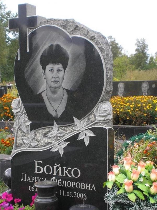 Вертикальный резной памятник с крестом и розами. На стеле установлена гранитная ваза.